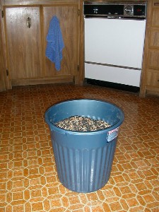 I have a small plastic garbage can with lid in my pantry that currently holds about 25 lbs. of seed. There are another eight suet cakes in my refrigerator and two or three birdseed bells on a pantry shelf. The sad thing is that this will probably only last until early to mid summer. I refill that birdfeeder a couple of times a week, at least. The suet cakes are popular and get pecked away quickly. But I suppose the birds are happy.