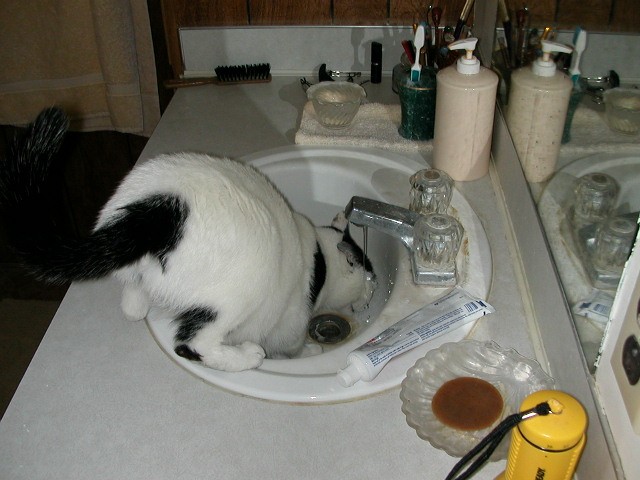 Allow me to explain. She will only drink from a faucet; she will absolutely not drink from a bowl. And don't give me the line about not giving in because she'll drink from the bowl when she gets thirsty enough. I tried that. She got dehydrated. So what the hell, she can drink from the faucet if it makes her happy.