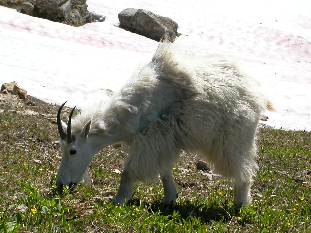 A mountain goat munches on the glacier lilies, not bothering to pay much attention to the humans tiptoeing around and taking pictures.