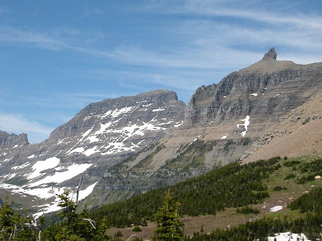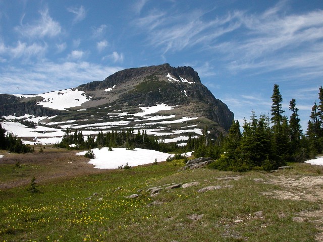 More photos from Glacier National Park. It always seems so dramatic to me to see patches of green foliage mixed with patches of frozen white, with grey stone towering over it all.