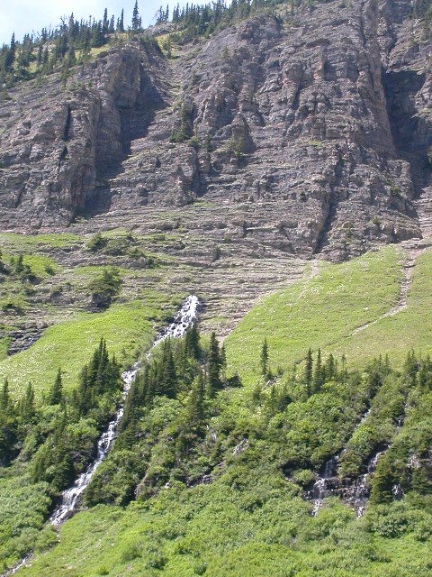 Summer at Glacier National Park. Even in July there are patches of snow in the mountains. However, with warmer temperatures those snow patches keep slowly melting and provide trickles or even cascades of crystal-clear water down the cliffsides.
